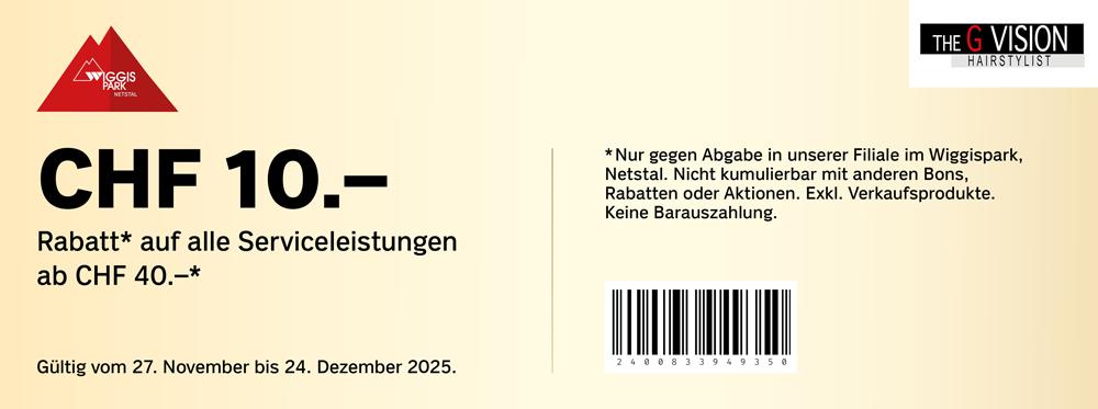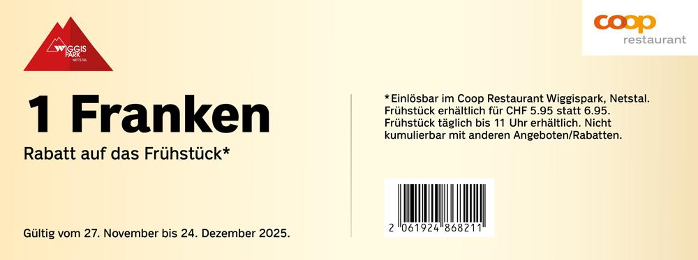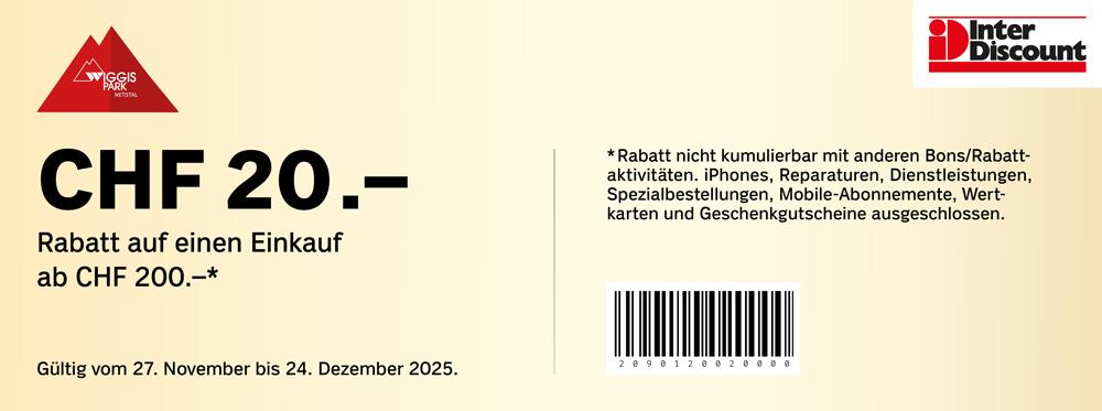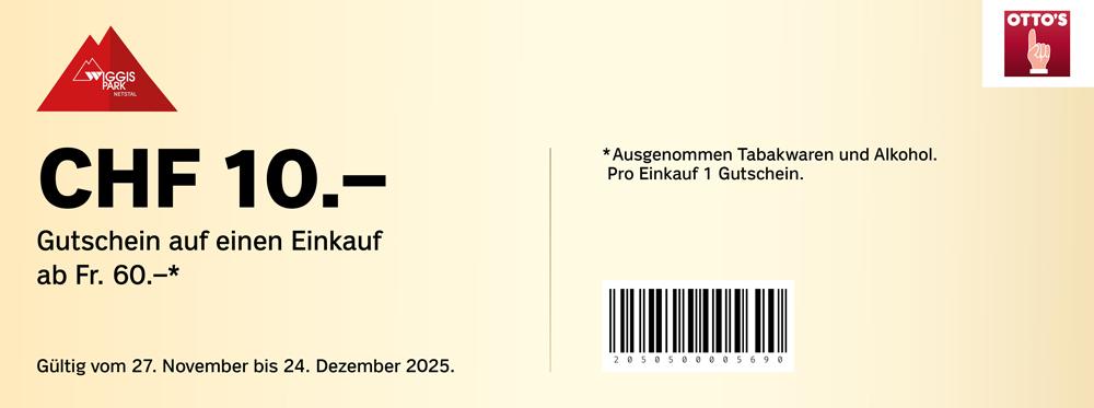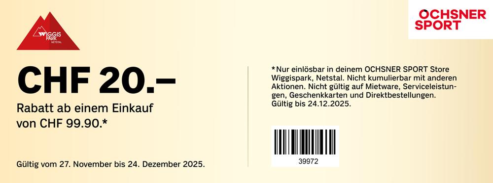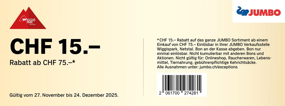 | Geschenkt: Coop-Geschenkkarte im Wert von CHF 20.- ab einem Einkauf von CHF 100.- bei Coop und Jumbo im Wiggispark Netstal. | 11.00 | bis | 17.00 |