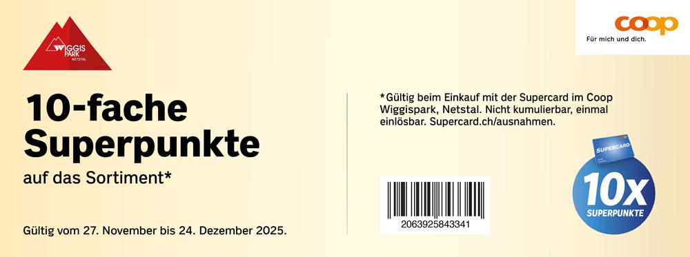 | Ausserdem: +1000 Superpunkte ab einem Einkaufswert von CHF 100.- bei Coop und Jumbo im Einkaufszentrum Wiggispark Netstal. (supercard.ch/ausnahmen) | 10.00 | bis | 17.00 |